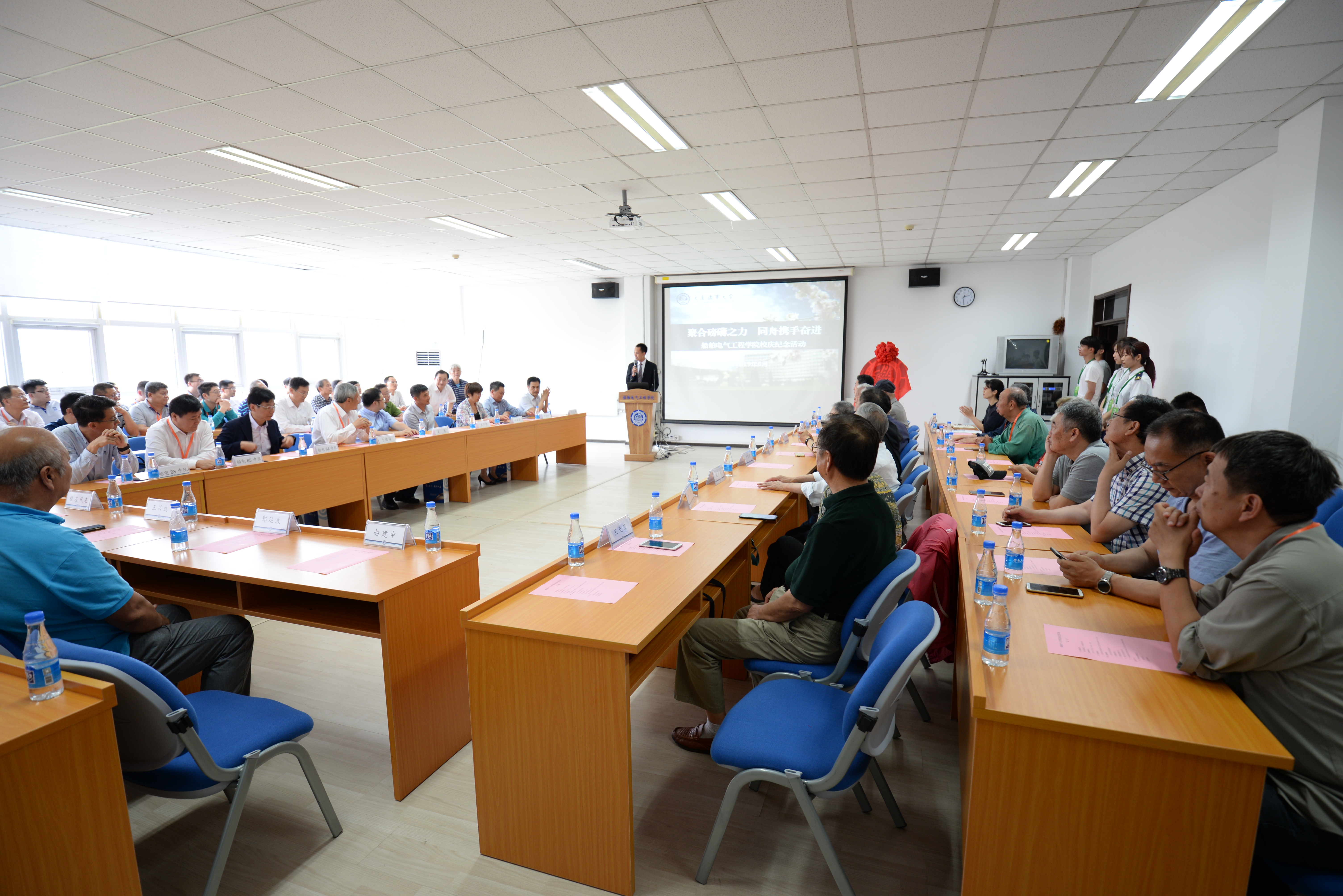中远海运船员管理公司大连分公司党委书记周世辉,锦州航星集团党委书记王敬前和高级工程师王洪余,大连北方互感器集团有限公司总工程师王仁焘和高级工程师宋仁丰,中车大连电力牵引研发中心有限公司副总经理总工程师吴涛和副总工程师车向中,大连光洋科技集团有限公司董事长于德海和总经理于本宏,学院的老领导、老教师、校友代表及学院现任院长赵宏革、副院长牛小兵、于奕宁和教师代表参加。