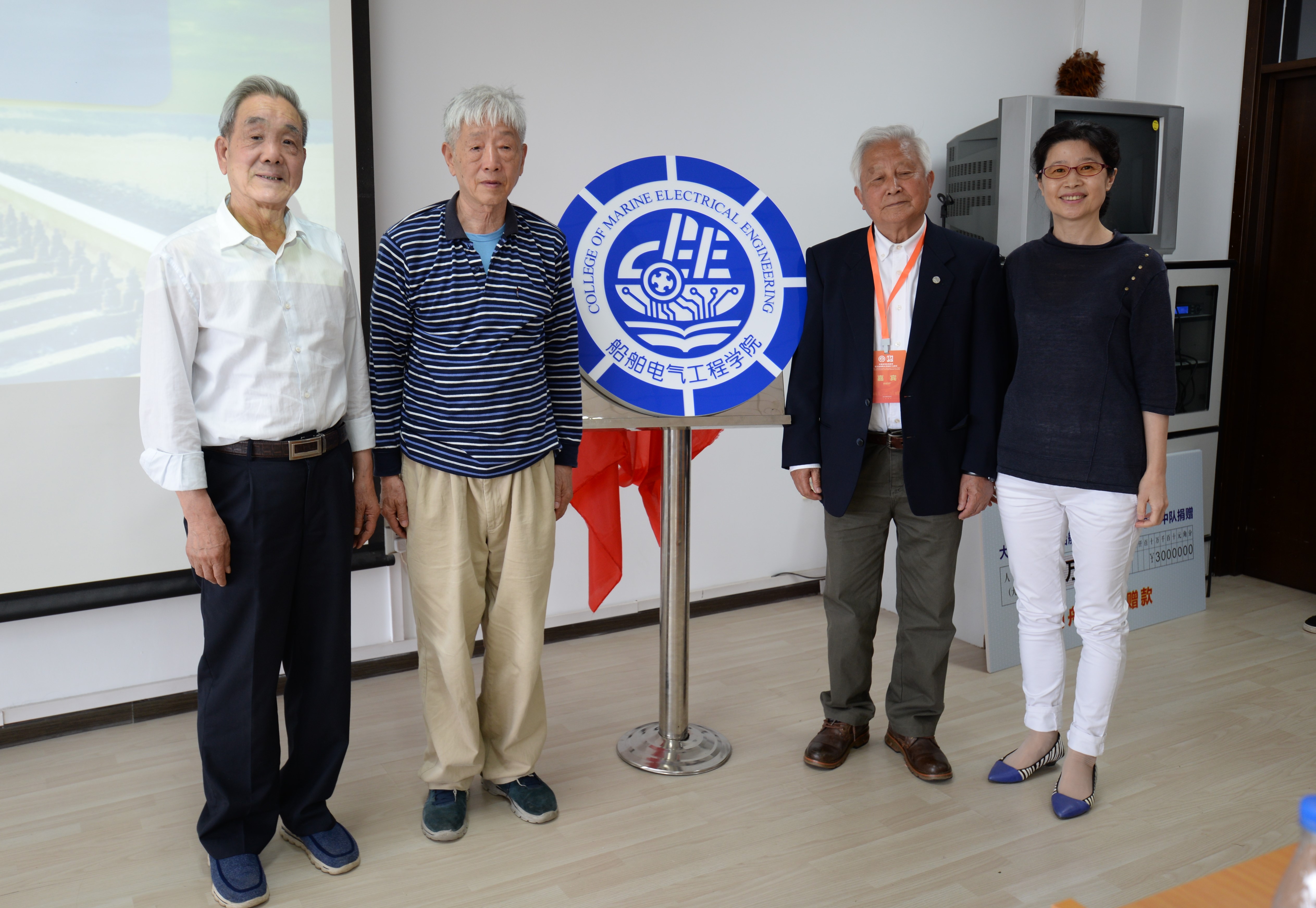 于奕宁与自动化专业贾欣乐老师、船电专业樊印海老师、校友代表汪定富共同为院徽揭牌。