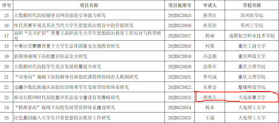 近期,教育部公布了2020年度教育部人文社科研究专项任务项目(高校辅导员研究)的立项通知。我院党委副书记胡明久申报的项目《移动互联网时代高校意识形态安全建设有效策略研究》喜获立项。