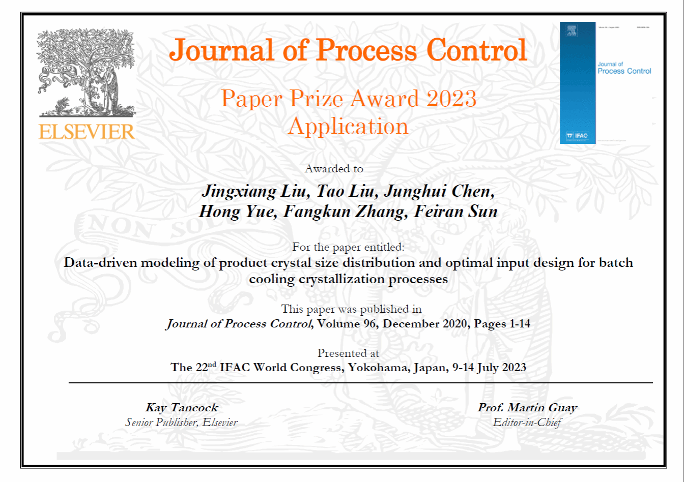 近日,经国际自动控制联合会(The International Federation of Automatic Control,IFAC)奖励委员会通知获悉,欧博abg官方网站刘井响副教授作为第一作者,发表在IFAC会刊Journal of Process Control上的论文“Data-driven modeling of product crystal size distribution and optimal input design for batch cooling crystallization processes”喜获2020-2022年过程控制期刊最佳论文奖 (IFAC Journal of Process Control Paper Prize),并受邀参加2023年7月9-14日在日本横滨召开的第二十二届IFAC世界大会上举行的颁奖仪式。