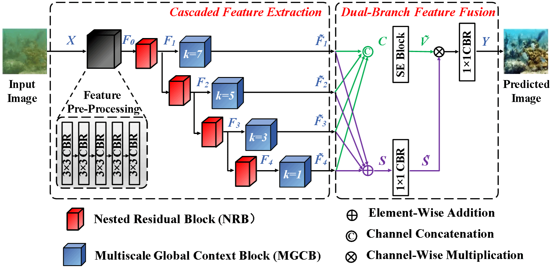 海洋作为地球的重要组成部分,蕴藏着丰富的生物与矿产资源,对人类可持续发展与未来生存具有战略意义。随着全球海洋资源开发竞争加剧,构建智慧海洋体系、实现精准环境感知已成为我国海洋强国战略的核心任务。然而,受水体对光照吸收与散射效应的物理约束,当前水下视觉感知技术仍面临严峻挑战,具体表现为水下光视觉图像普遍存在对比度低、色彩失真、细节模糊等问题,严重影响其在海洋工程、海洋资源勘探以及水下考古等领域的实际应用效果。传统水下视觉感知增强技术因算法复杂、硬件要求高以及泛化性差等缺陷,普遍难以满足实际需求。因此,开发一种高效、低延迟且易于实际部署实施的深度神经网络模型,切实提升水下视觉质量,已成为推动海洋相关领域发展的关键。