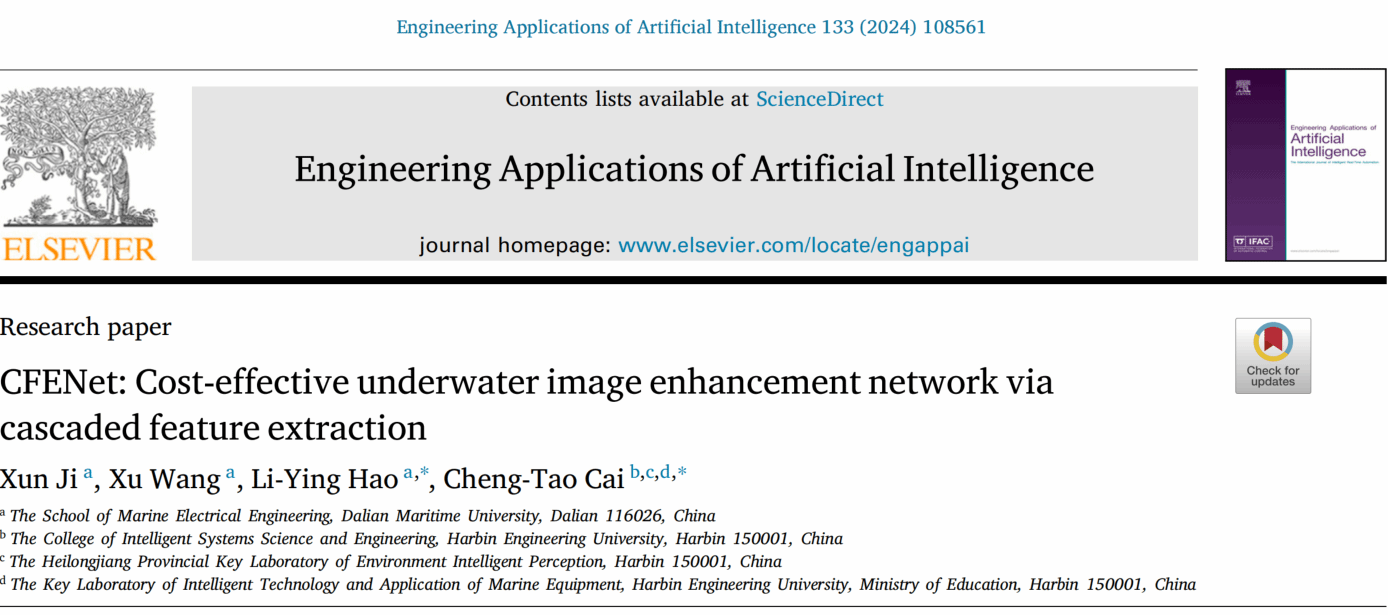 针对水下视觉感知增强问题,欧博abg官方网站郝立颖教授团队在《Engineering Applications of Artificial Intelligence》(EAAI)发表题为“CFENet: Cost-effective underwater image enhancement network via cascaded feature extraction”的科技论文。EAAI为人工智能领域权威期刊,最新影响因子7.5,现属于中科院1区Top期刊。