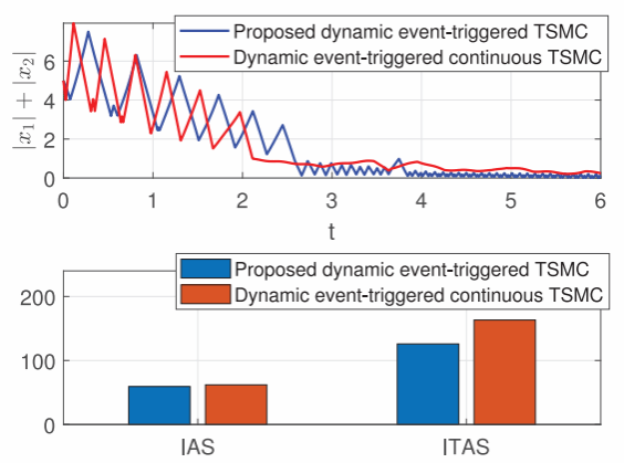 如图2所示。从图3和图4可以看出,在静态和动态事件触发条件下所提出的控制方法均保证系统的收敛。所提出的事件触发NTSMC实现了更低的积分绝对误差(IAS)和(ITAS)积分时间绝对误差值,这反映了该方法在系统的短期和长期行为方面均具有更优性能。