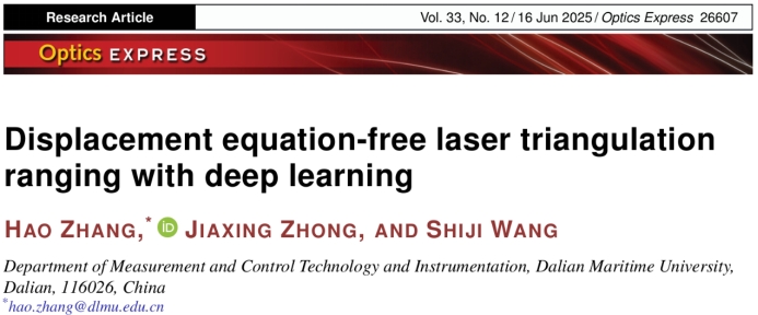 围绕上述问题,张浩副教授在光学中科院二区Top期刊《Optics Express》发表题为“Displacement equation-free laser triangulation ranging with deep learning”的研究论文,创新性的提出了一种基于深度学习的智能激光三角测距方法,首次使用深度神经网络取代了激光三角传感器诞生以来使用了数十年的基于系统结构参数的位移测量方程,成功消除了系统结构参数误差通过位移方程对测量结果的传播和影响,显著提高了测量精度。