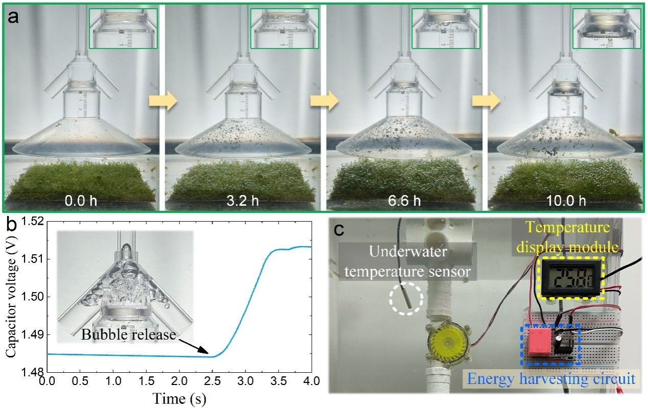 图3光合作用产生的超低通量气泡的能量采集和利用。a. 多孔阀下方超低通量光合气泡的产生和累积过程;b.气泡释放前后储能电容器的电压变化; c.利用收集到的气泡能量驱动一个带有温度显示模块的水下温度传感器。