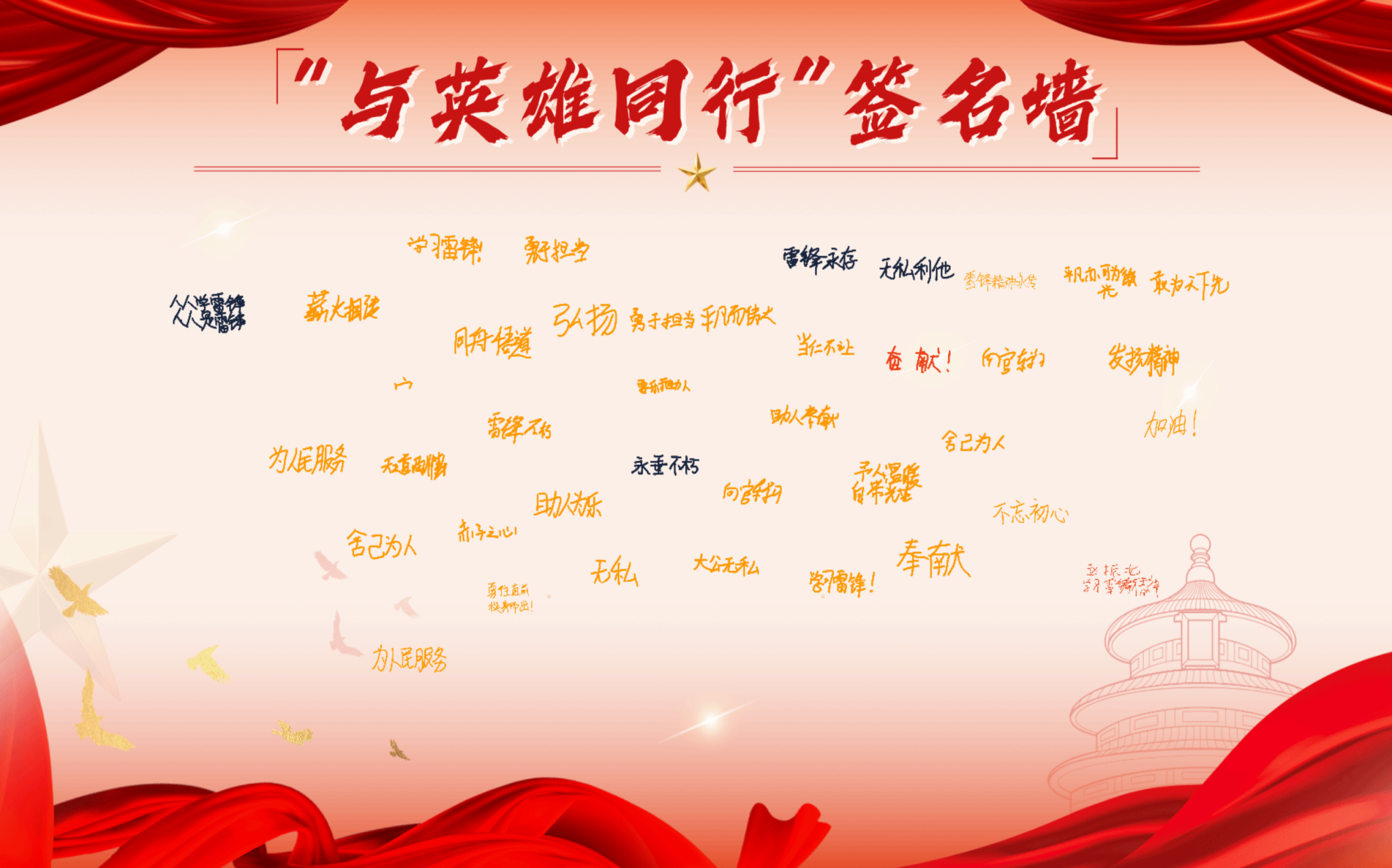 现场播放了学院学生自制的AI主题视频,用更生动的方式表达了船电青年将接过前辈的接力棒,将雷锋精神转化为实际行动的决心。全体同学通过AI小程序签署了“与英雄同行”倡议书,带着这份初心与担当,让雷锋精神在实践中绽放更耀眼的光芒。